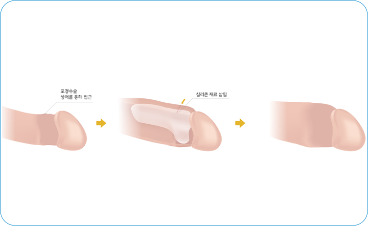 주로 판형 혹은 특수한 형태의 실리콘 보형물을 삽입하여 확대와 함께 감각 민감도를 조절합니다. 실리콘은 인체 면역반응 혹은 생체 독성이 거의 없으며 원치 않을 경우 제거가 쉬운편입니다. 어떤 보형물의 선택에 따라 거의 티가 나지 않는 자연스러운 형태부터 특정 자극점을 강조할수도, 확대효과를 극대화할 수도 있다는 장점이 있습니다.