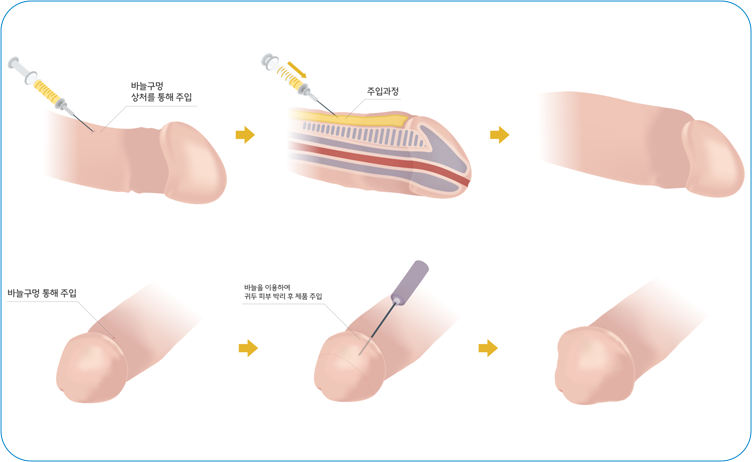 필러를 주입해 확대와 함께 민감도를 조절합니다. 성기의 몸통과 귀두에 각각 적용이 가능하며 동시에도 적용이 가능합니다. 판형 재료 삽입술에 비해 환자가 각자 원하는 모양을 형성할 수 있다는 장점이 있고, 다양한 재료(히알루론산, 진피분말, 자가지방)를 모두 이용할 수 있다는 장점이 있습니다.