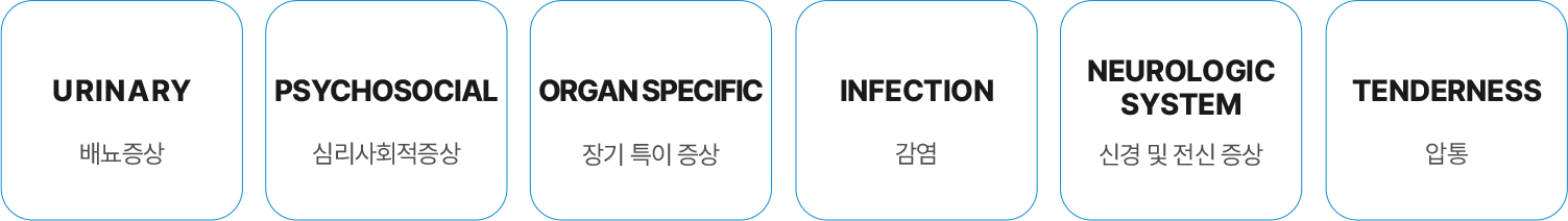 UPOINT 접근법은 각각 U(배뇨증상), P(심리사회적증상), O(장기 특이 증상), I(감염), N(신경 및 전신증상), T(압통)으로 증상을 나누어